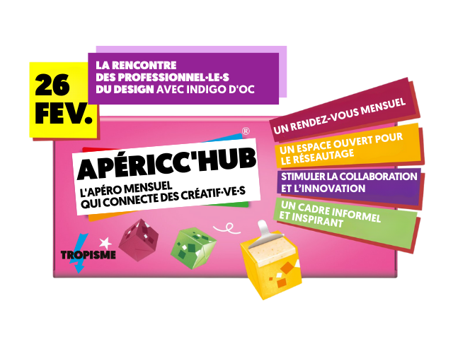Ce mois-ci, les APÉRICC’HUB invitent Indigo d’Oc, collectif de designers montpelliérain·e·s. Pour cette édition, quatre designers viendront présenter leurs projets et échanger sur leurs démarches. Une rencontre croisée pour découvrir leurs travaux, partager leurs expériences et nourrir les discussions autour du design et de la création.