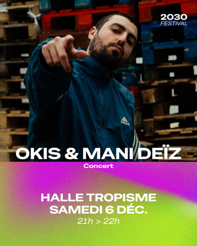 Jeune artiste lyonnais, Okis est le pur produit de son environnement. Initié au rap français grâce à ses frères et sœurs, il se prend d’amour pour les plumes sincères et brutes qui caractérisent le hip hop. Okis est de retour en 2025 avec des nouveaux projets : LA CRÈME sorti en mars et plus récemment DOUBLE CRÈME qui réunit huit titres à l'aspiration jazzy et drumless, dans une atmosphère plus nuageuse et tendue que sur le premier opus. Mani Deïz — beatmaker, rappeur, ingénieur du son, directeur artistique et réalisateur de clips — façonne la musique comme un “décorateur de silence”. Autodidacte des premières heures, il passe du bricolage sur un vieux logiciel du siècle dernier aux grandes collaborations du rap français (de Kool Shen à Furax en passant par Lacraps et Caballero). Avec plus de vingt albums au compteur depuis 2011, il explore sans cesse de nouveaux territoires sonores. Après avoir marqué le boom bap, Mani se réinvente : son virage trip hop avec Infinity -1 marque une mutation assumée. Toujours en quête de plus loin, plus profond, plus inattendu.